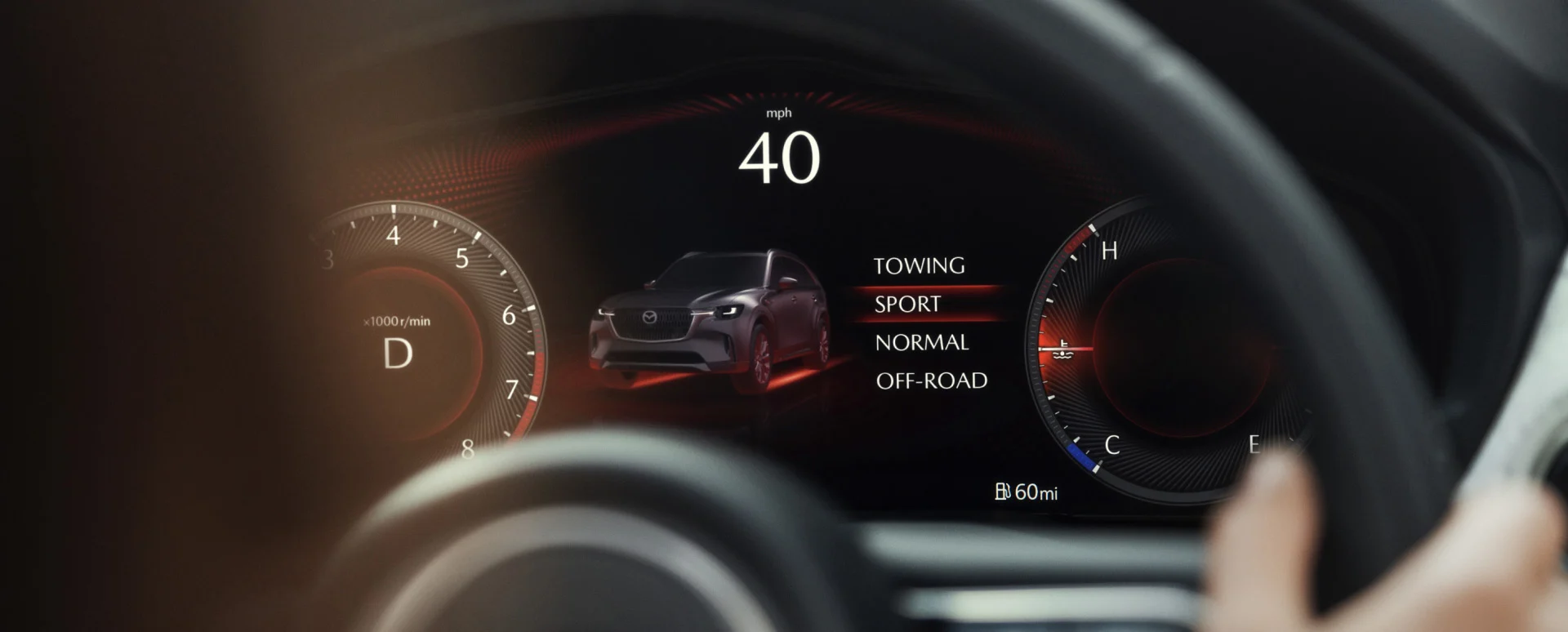 Each Mi-Drive mode in the CX-90 is designed to maintain an intuitive connection to the road by optimizing responsiveness and traction. Including Normal mode, drivers can switch between four distinct Mi-Drive modes. Sport enhances responsiveness and provides additional quick acceleration. Off-road improves driving performance in all conditions. And when equipped, Towing mode3 allows for a towing capacity of up to 5,000 lbs on select trims.